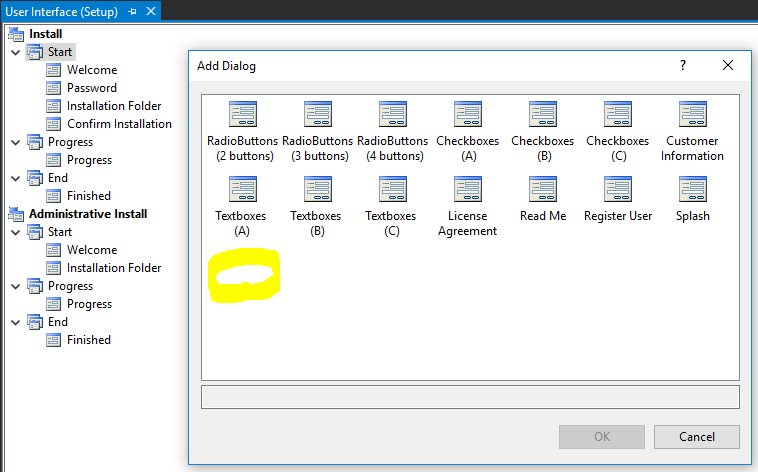 我已经用VisualStudio2017专业版(.vdproj file)创建了一个安装项目。我想使用本页中建议的密码对话框: