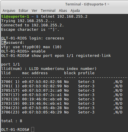telnet 192.168.255.2 & < enable; show port epon 1/1 registered-link;