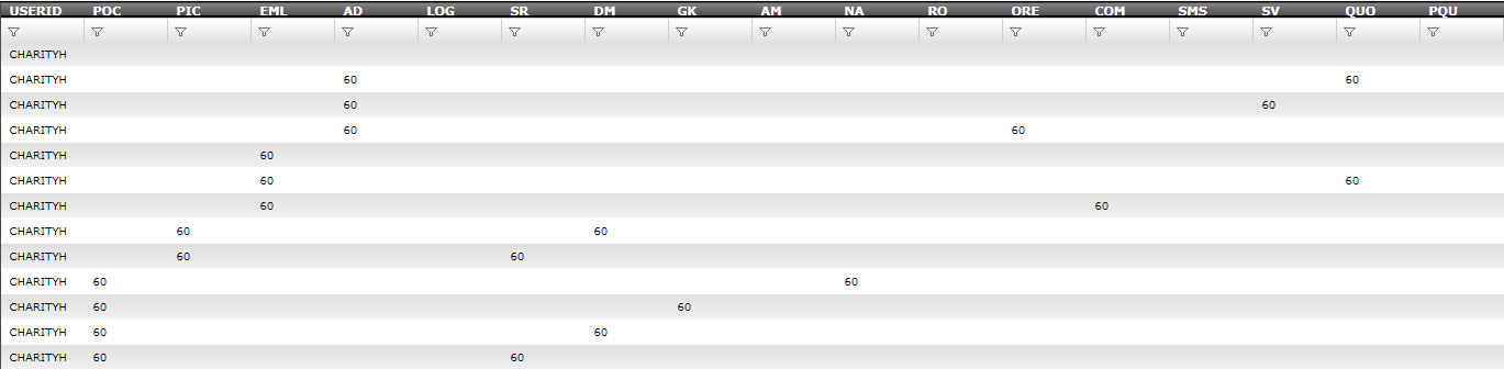 GROUP BY RESULT_COUNTS.USERID;然后有一个列,其中包含ACTVCODE = 'POC'的行数。