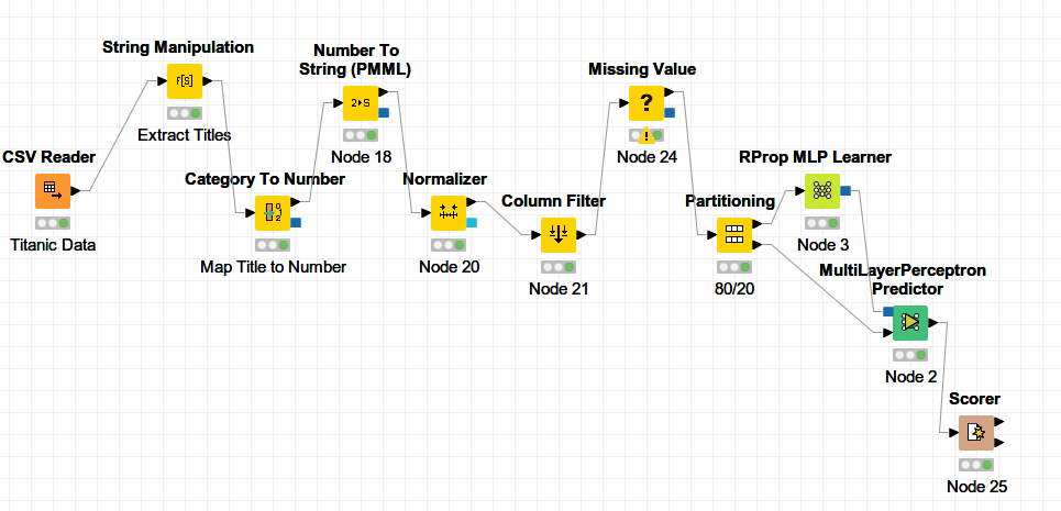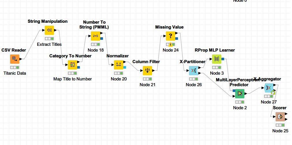我正在使用Knime,我已经创建了一个使用MLP (MultiLayer感知器)的神经网络。效果很好。您可以忽略所有的黄色节点,因为它们所做的只是重新格式化数据表。