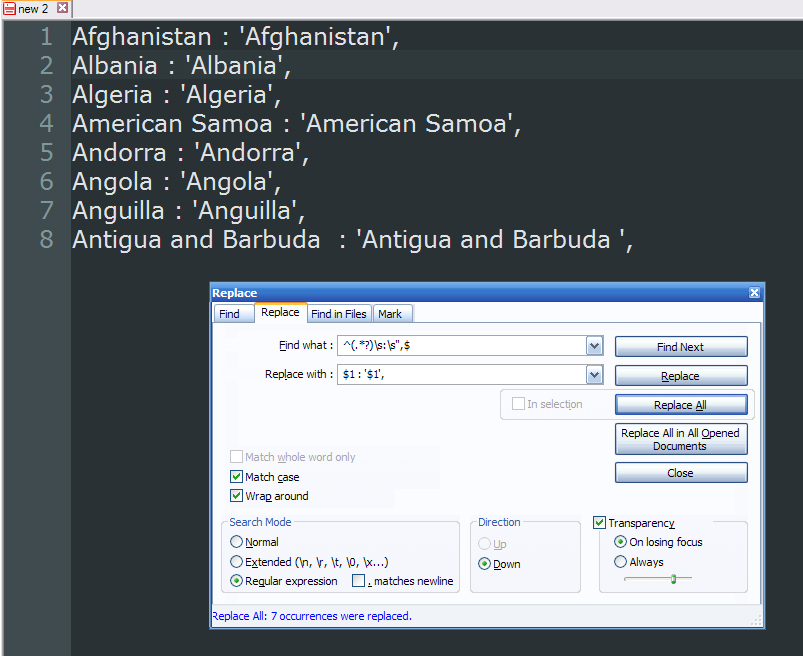 我想知道我们是否可以用notepad++完成下面的工作。我有一份世界上所有国家的详尽清单,这是其中的一小部分: