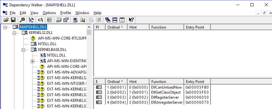 例如,查看mapishell.dll COM服务器( MS的一部分),我们看到(除了注册之外)没有任何东西被导出,尽管我们知道存在一些功能。