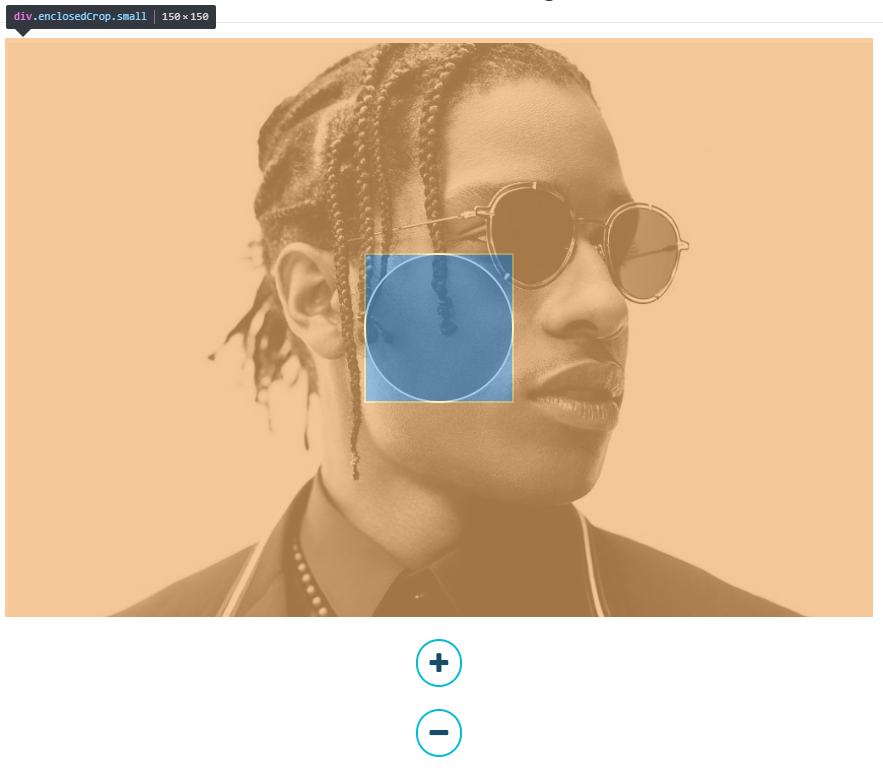我有一个150乘150平方,在我的图像中心,如链接的克罗皮例子类似地显示。然而,正如您所看到的,您可以移动和缩放图像,这意味着在Imagick中从中心裁剪并不总是工作,这取决于用户如何将他们的图像定位在中心点。