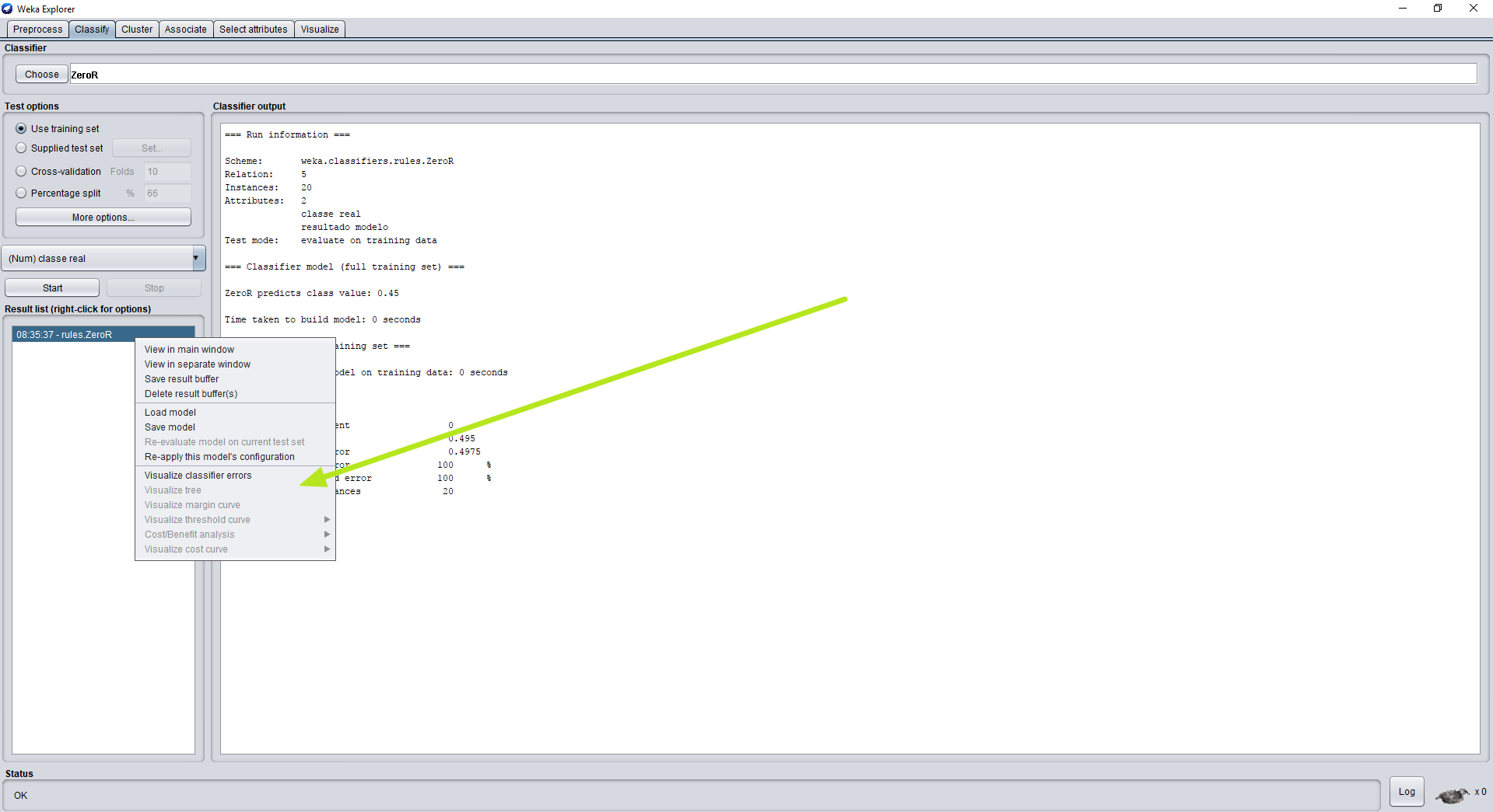文件加载良好,就像以前保存的一样,使用excel进行分隔。问题在于构建决策树本身:我转到选项卡分类,选择测试选项“使用培训集”并开始。