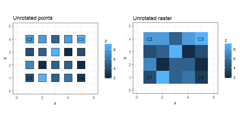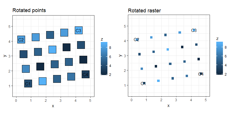 geom_points()的地块旋转时没有任何其他差异(点大小由size = 10显式控制),但geom_raster()图中的块明显缩小。