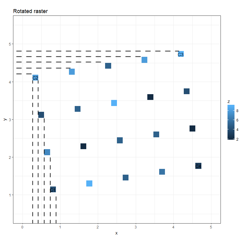 p.rot + geom_raster() + geom_text() + ggtitle("Rotated raster")