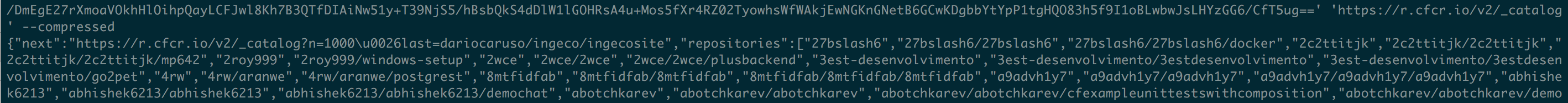 curl -H 'Host: r.cfcr.io' -H 'User-Agent: MyAgent' -H 'Authorization: Basic .....' --compressed 'https://r.cfcr.io/v2/token?account=<account>&service=r.cfcr.io'然后使用相同的方法,我们可以查询完整的目录: