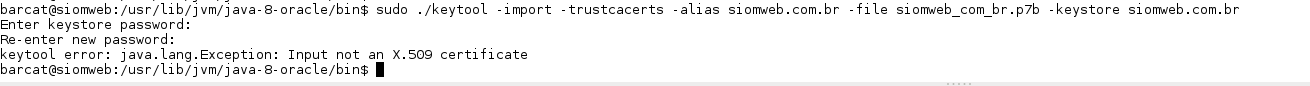 软件层支持团队,已经将链接https://www.digicert.com/ssl-certificate-installation-tomcat.htm指定为帮助,当我执行命令时,我得到了错误:keytool错误:java.lang.Exception: Input而不是X.509证书