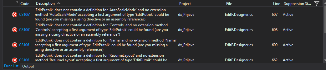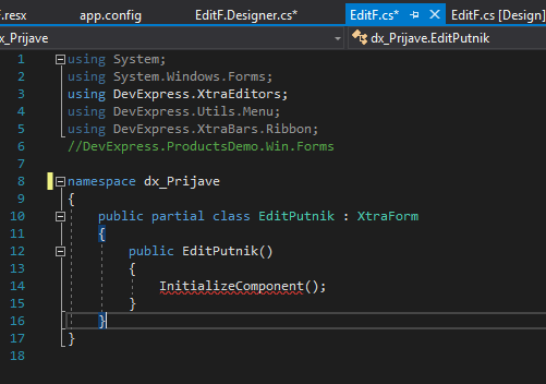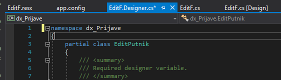 打开EditF.Designer.cs文件(不是视觉设计器,而是C#代码文件)并更改命名空间。确保将类重命名为EditPutnik。
