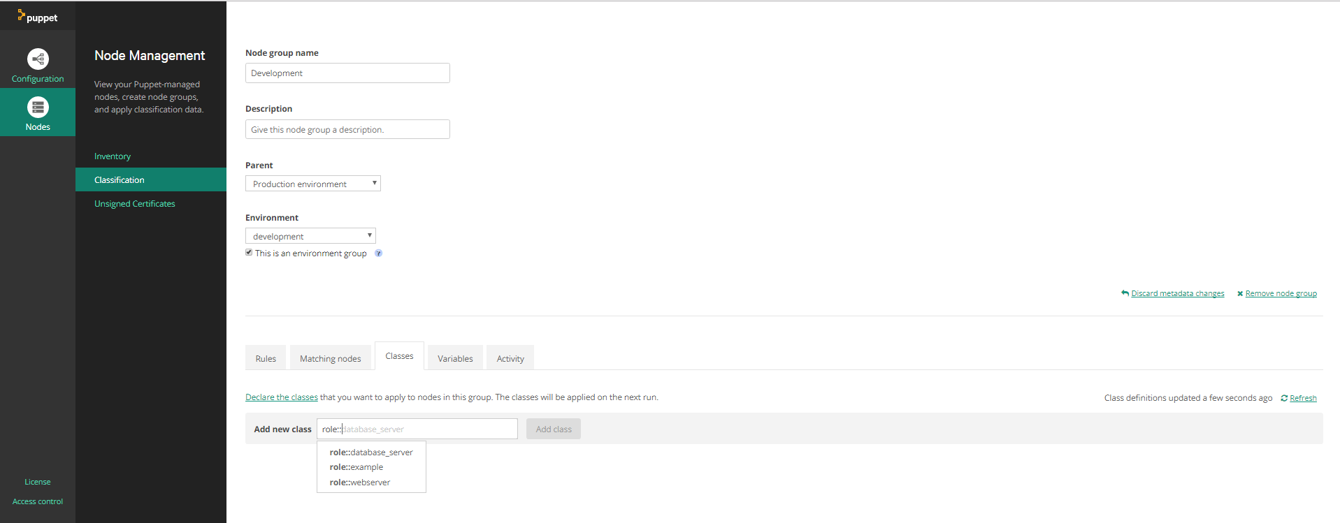 puppet-code deploy --all --wait 在Puppet中,我创建了开发环境,并将生产添加为父环境,但我无法在类列表中找到role::docker或profile::docker。我也试过刷新,但没有帮助。