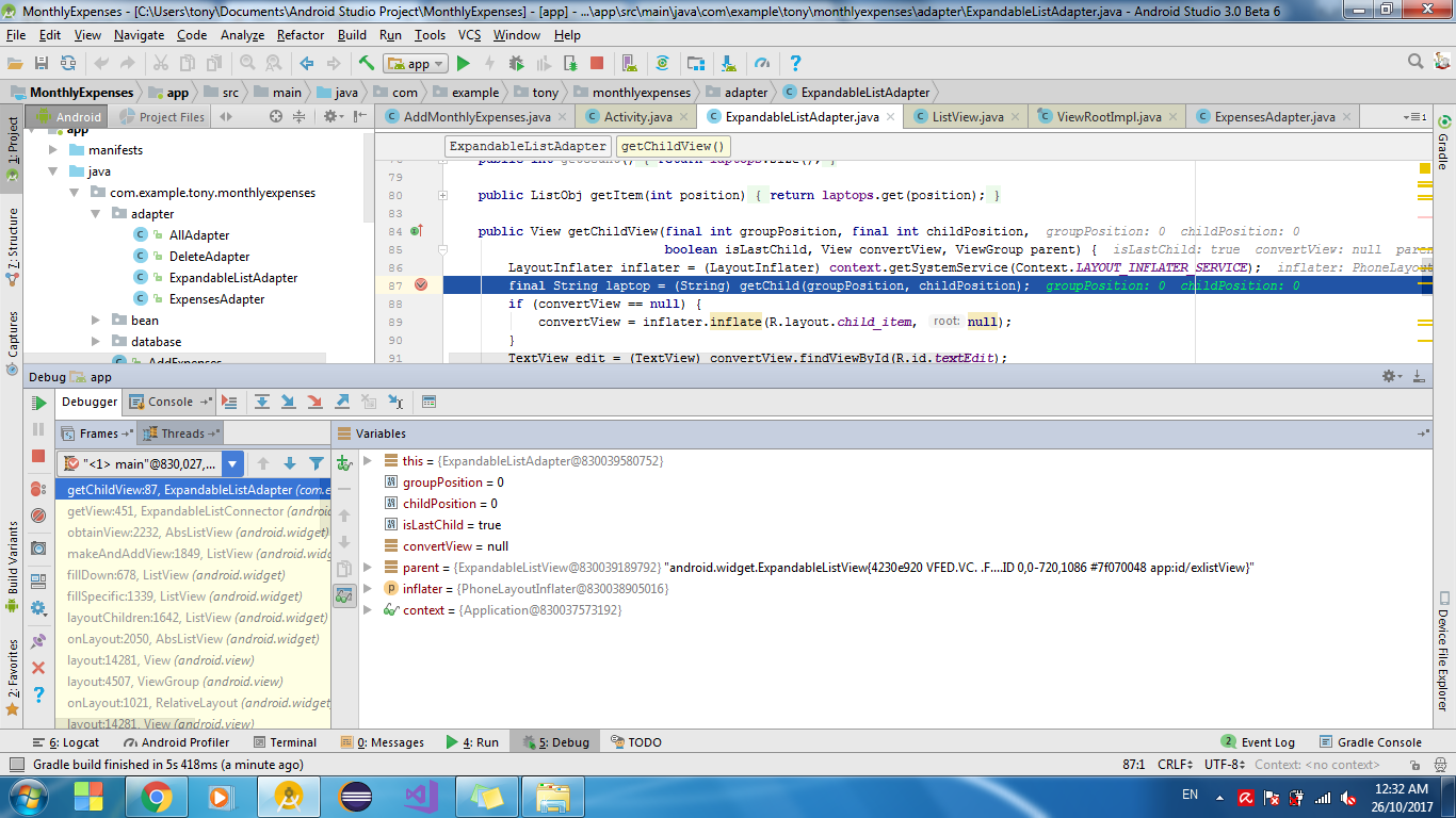 10-26 00:03:57.114 23612-23612/com.example.tony.Monthly管理费E/AndroidRuntime:致命异常:主java.lang.NullPointerException在com.example.tony.monthlyexpenses.adapter.ExpandableListAdapter.getChild(ExpandableListAdapter.java:42) at com.example.tony.monthlyexpenses.adapter.ExpandableListAdapter.getChildView(ExpandableListAdapter.java:87)在android.widget.ExpandableListConnector.getView(ExpandableListConnector.java:451) at android.widget.AbsListView.obtainView(AbsListView.java:2232)在android.widget.ListView.makeAndAddView(ListView.java:1849) at android.widget.ListView.fillDown(ListView.java:678)在android.widget.ListView.fillSpecific(ListView.java:1339)
