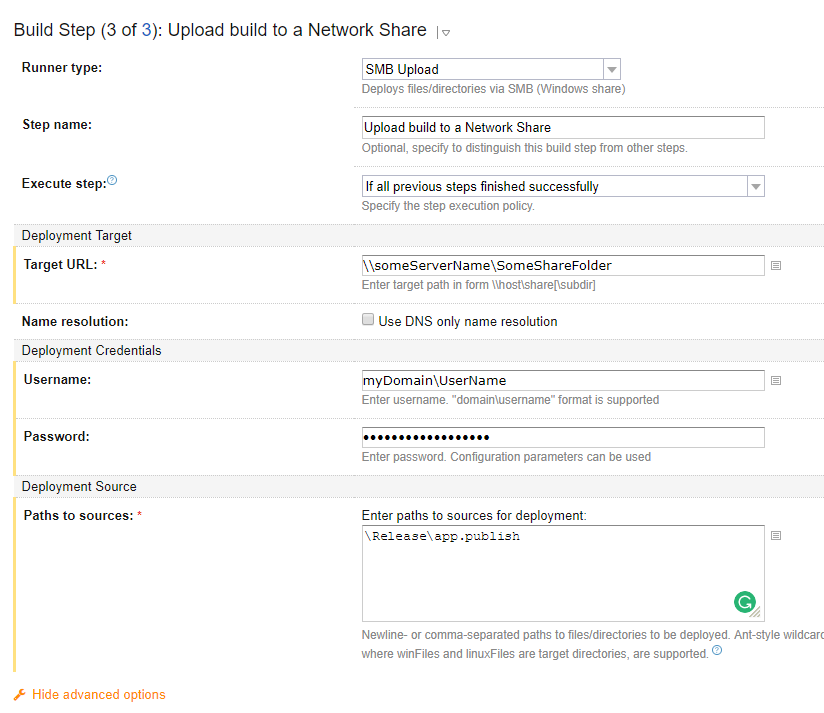 [04:11:28] [Step 3/3] Step Upload build to a Network Share (SMB Upload) failedTeamCity服务器和生成代理安装在同一台服务器上。TeamCity是专业2017.1.4 (构建47070)。生成步骤设置: