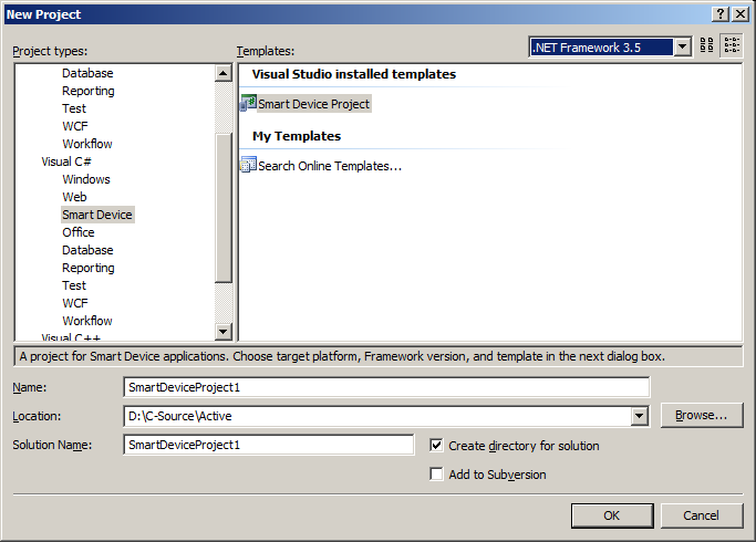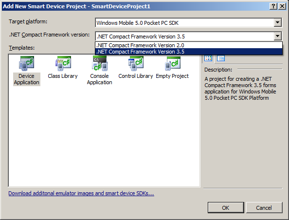 虽然第一个New向导显示已安装的完整.NET框架版本,但这些版本不会用于SmartDevice项目: