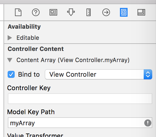 2)在Interface Builder中设置数组控制器,并在绑定检查器中将Array Controller的“模型密钥路径”设置为属性的名称: