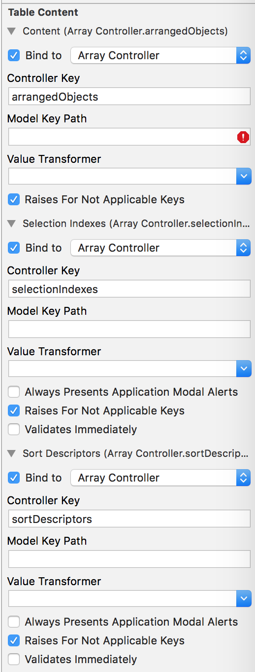 3)现在选择您的表视图,并在其绑定检查器中分别将其内容、选择索引和排序描述符绑定到arrangedObjects、selectionIndexes和sortDescriptors,为每个视图保留“模型键路径”空白: