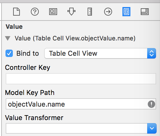 4)在表视图的单元格中选择文本字段,转到其绑定检查器,并将其绑定到表单元格视图,使用objectValue.的模型键路径,然后使用要在单元格中查看的属性名称:
