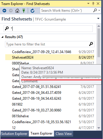这里有一些用户声音来建议在Visual中搜索Shelveset的改进,您可以去投票,以便在将来达到这个目的: