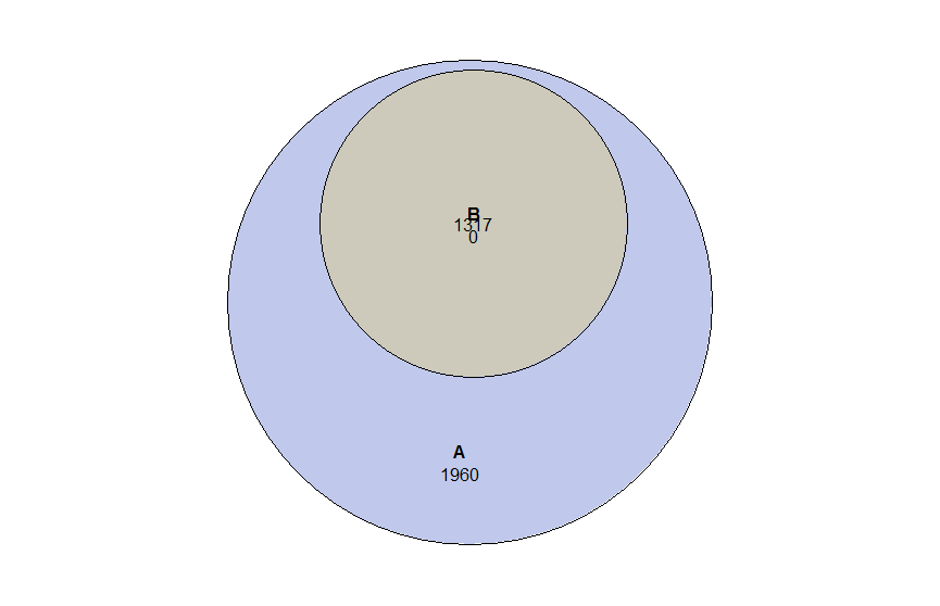 我正在尝试使用eulerr包来创建Venn图。我有两个列表,我想用它来创建Venn图。一个列表是第一个列表的子集。奇怪的是,eulerr似乎认为列表中有一个值。