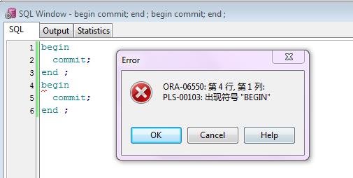我尝试在plsql code.But中包含两个开始-结束块,它给了我一个pls-00103代码,我检查了所有字符都在DBC中。