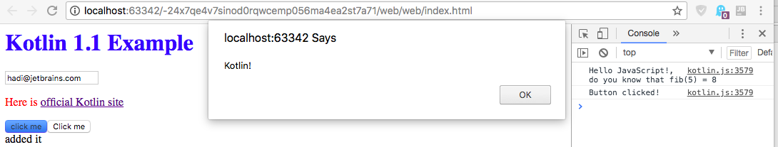 fun BUTTON(): HTMLButtonElement {return document.create.button()}创建了另一个具有以下内容的文件src/kotlin/Fib.tk,该文件是从Main.kt文件调用的,所有编译的文件都是single JavaScript文件: