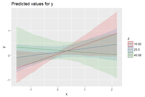 plot_model(m1, type = "int", terms = c("x", "z"), mdrt.values = "meansd", ppd = TRUE)