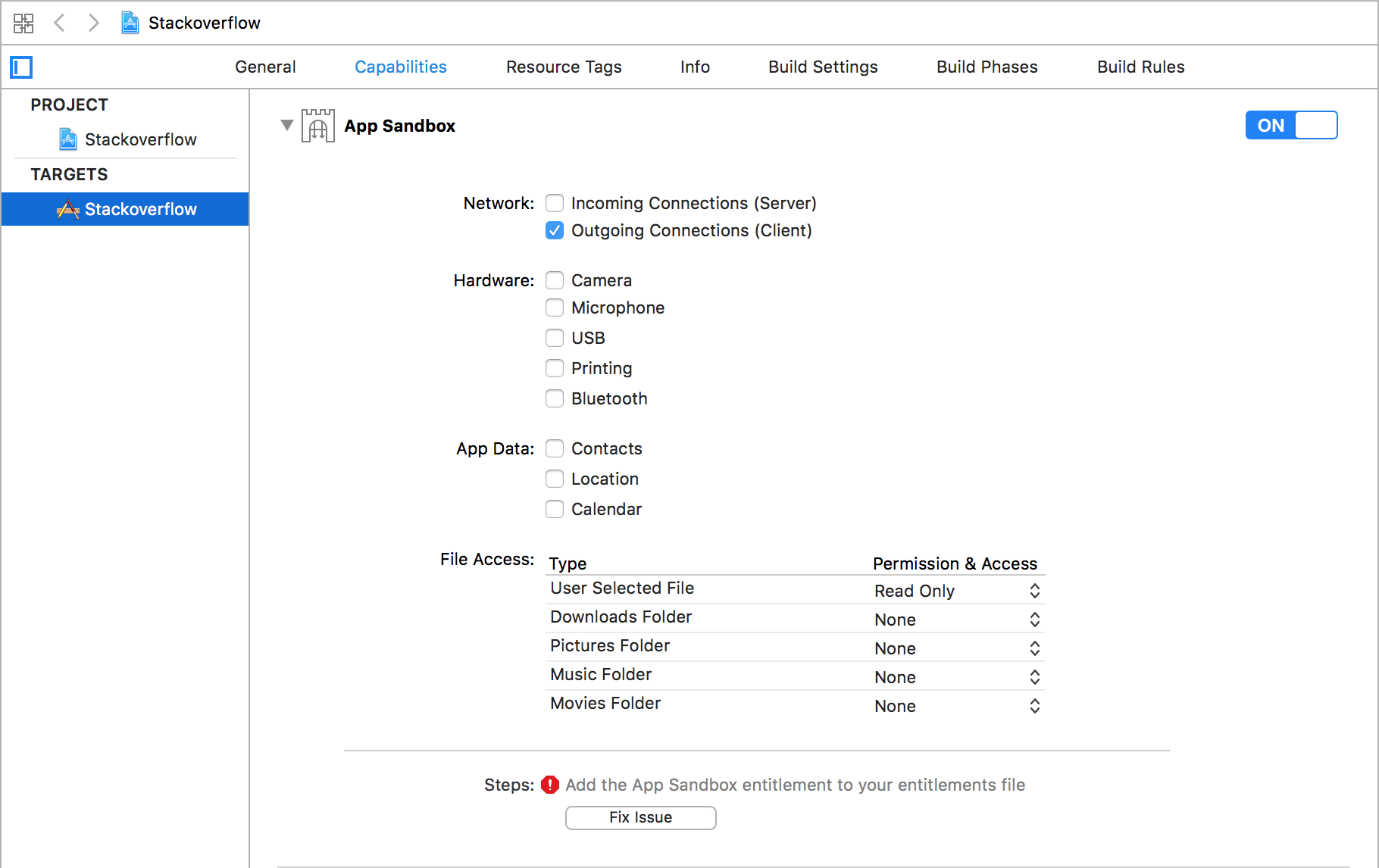 最后,必须在项目的Outgoing Connections (Client)下启用Capabilities。