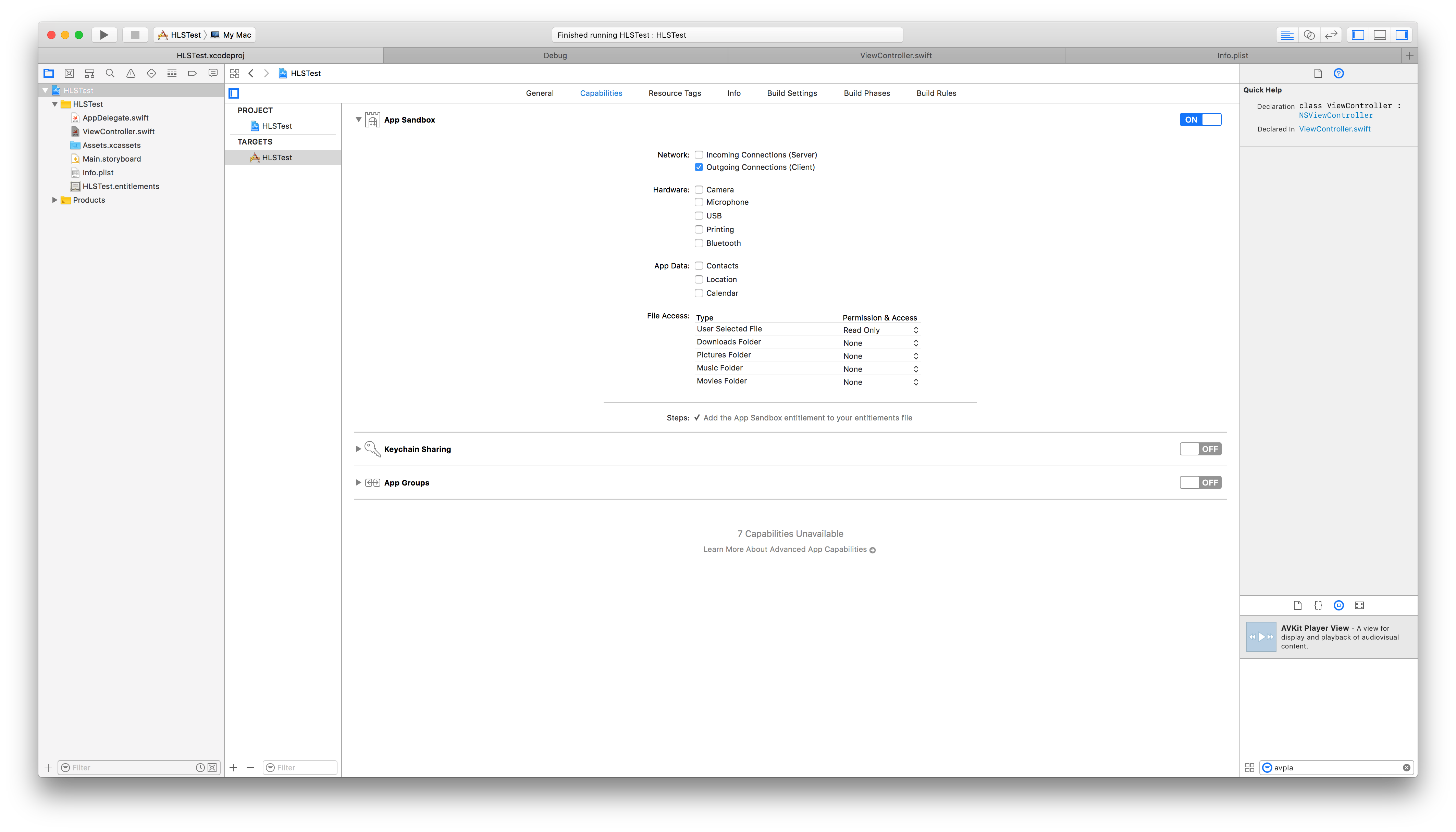我尝试了一个非常简单的Xcode OS程序,这个程序构建并运行,但是我在访问URL视频文件时遇到了错误。可能与某个地方的特权或安全设置有关,但不知道在哪里。下面是我在ViewController类下的程序: NSViewController: