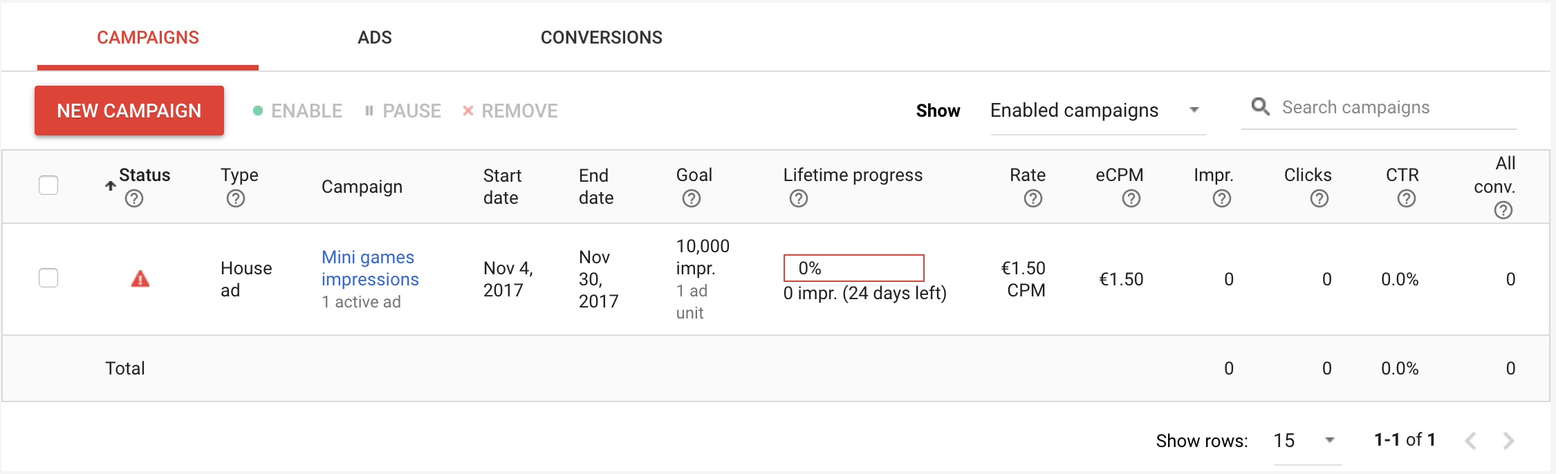 我已经在Admob平台下组织了一场内部运动。这场竞选活动持续了近3天,但我没有任何印象。