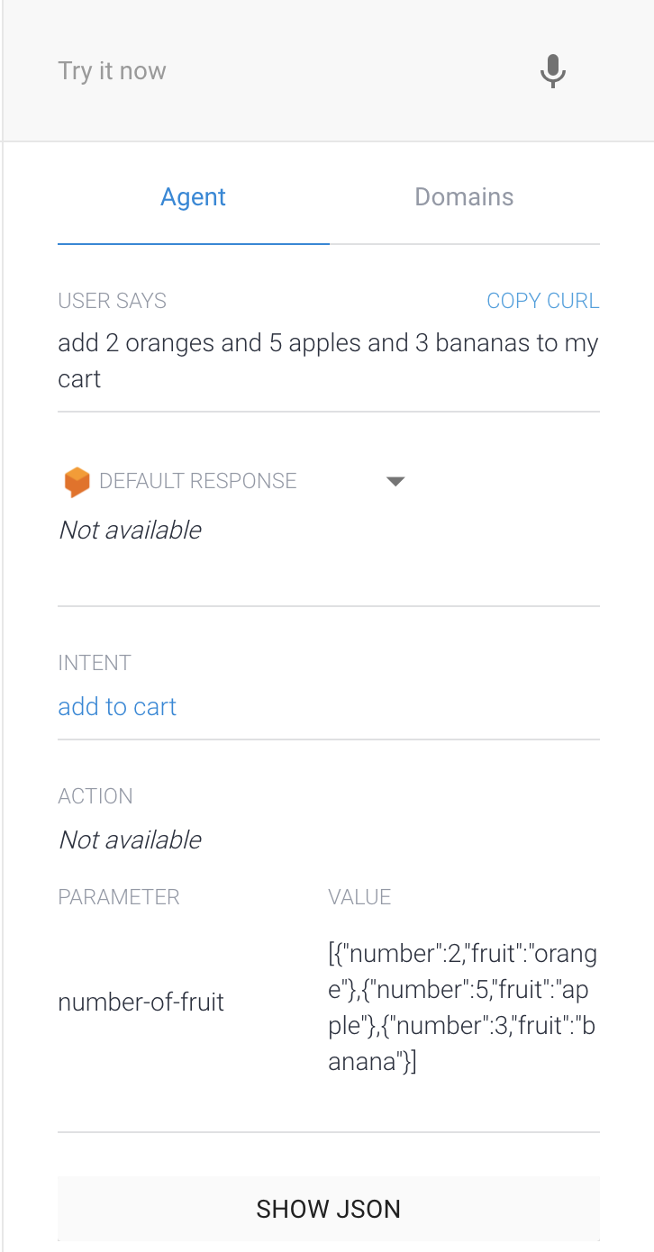 我需要接受来自API.AI的两个属性的列表,例如,用户可以这样说: