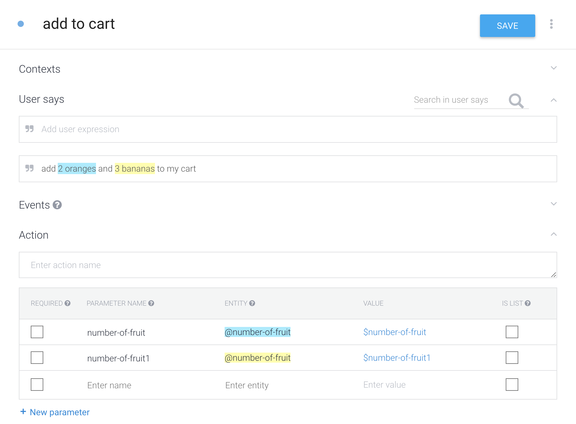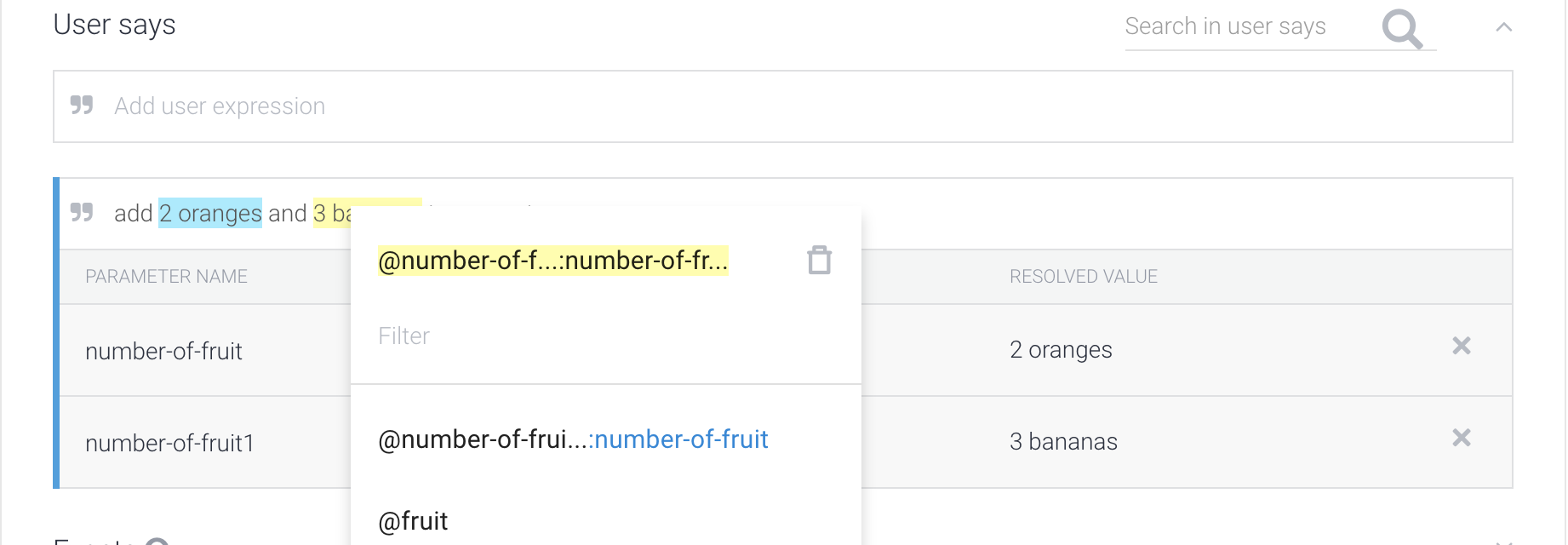但是,该示例中的事件目前被视为两个单独的参数,而不是一个列表。要将这些实体视为一个列表,而不是两个离散项,请选择第二个突出显示的示例,并单击与第一个参数对应的项(在屏幕截图中,该项目的蓝色文本为number-of-fruit):