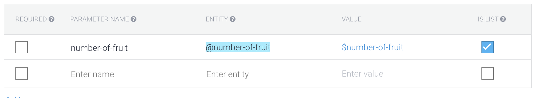 @sys.number-integer:number ( @sys.number-integer部件表示整数的系统实体,:number部件是我们给出的参数)@fruit:fruit ( @fruit部件是水果实体的名称,:fruit部分是我们将给出的参数的名称)现在,当您向意图添加包含此格式项的示例时,您将看到检测到了新的复合实体: