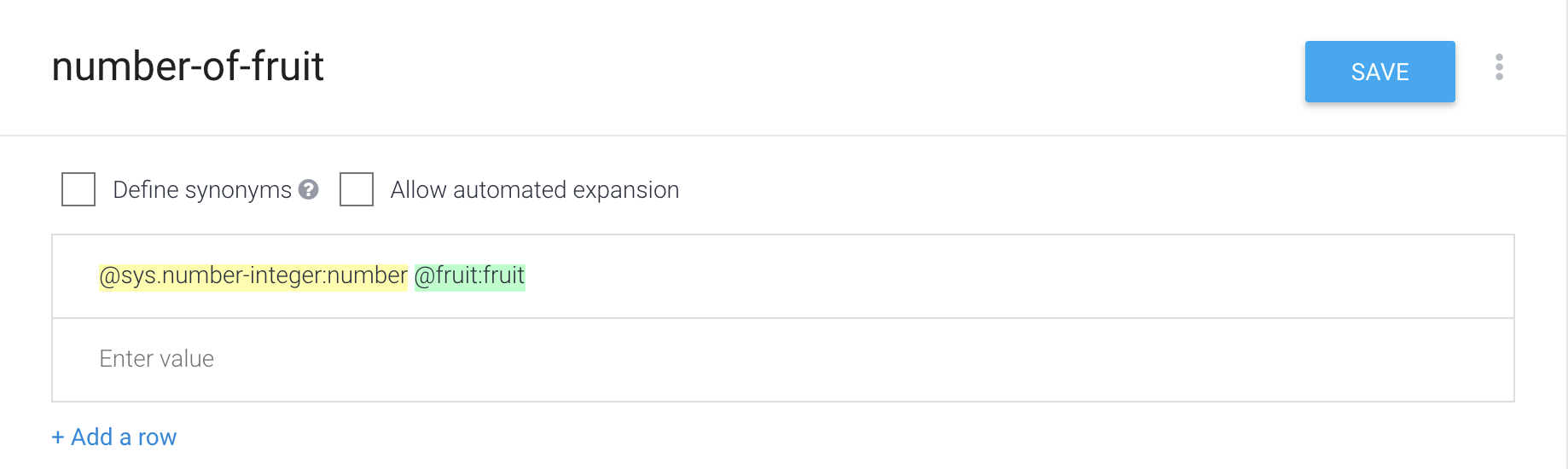 首先,创建一个列出所有水果及其同义词的实体(让我们称之为fruit)。