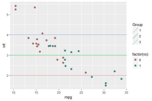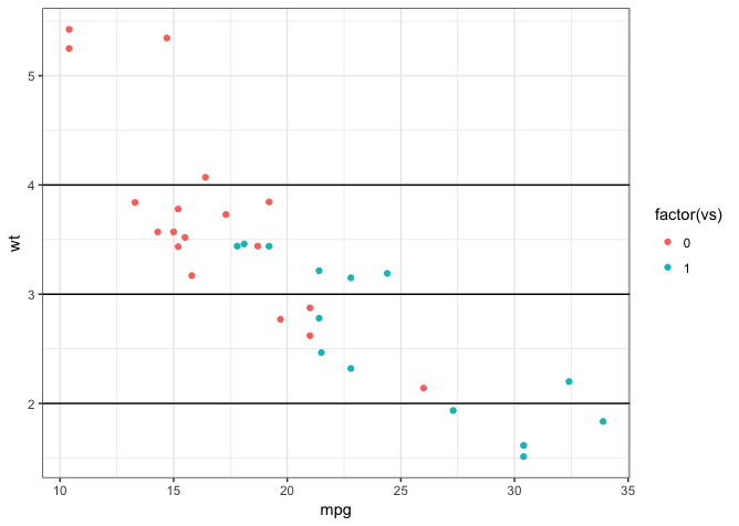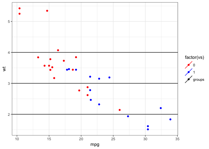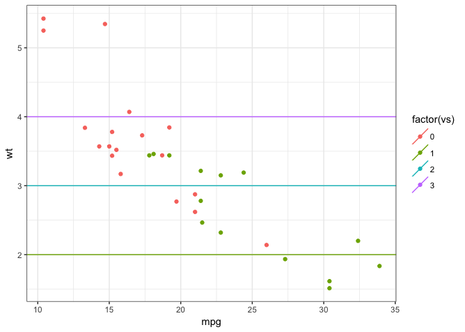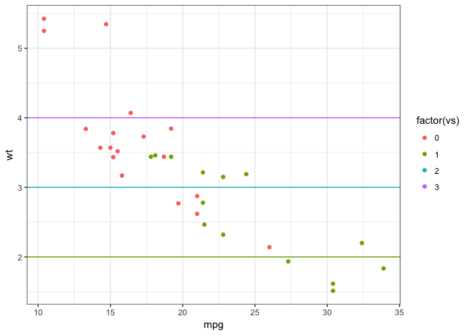 geom_point(data = mtcars, aes(x = mpg, y = wt, group = vs, color = factor(vs))) +