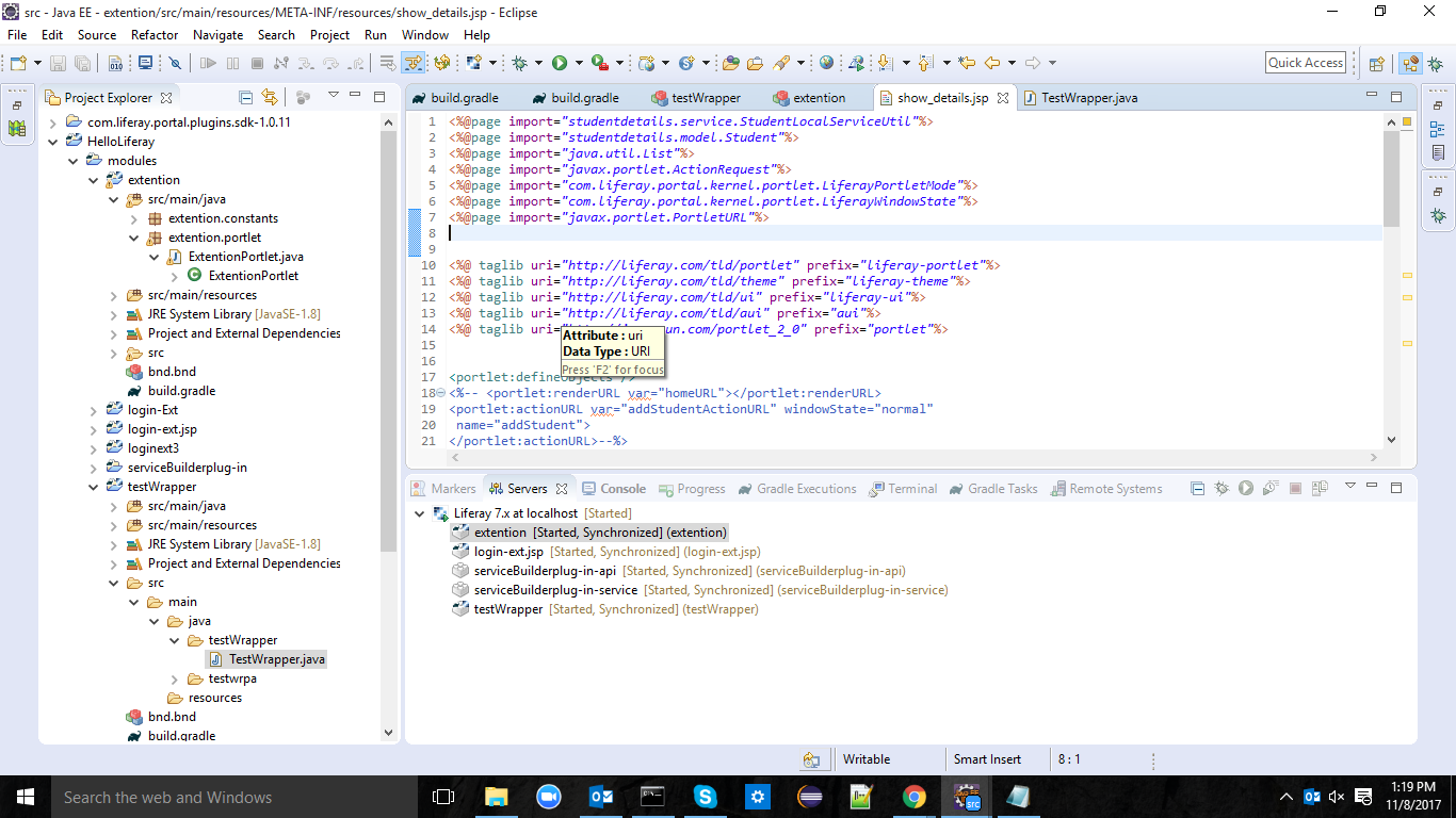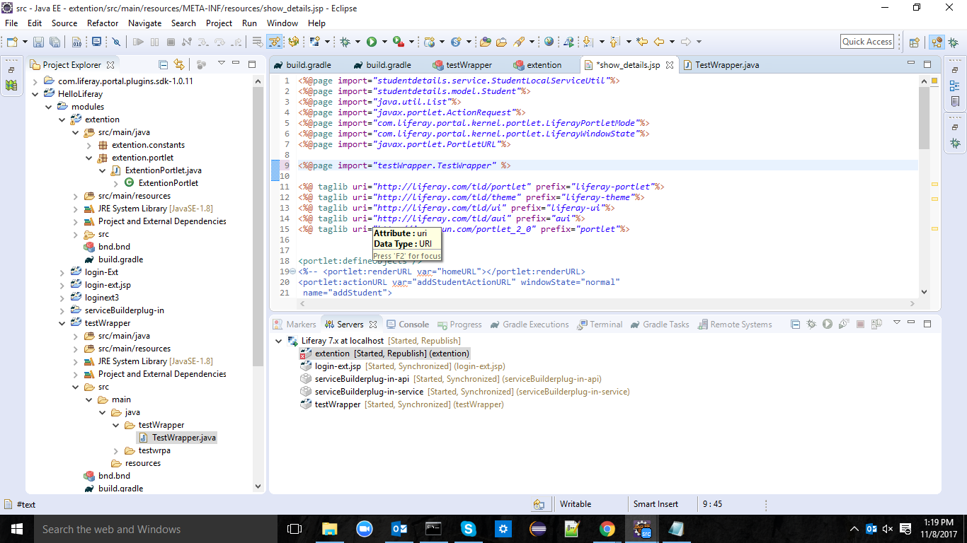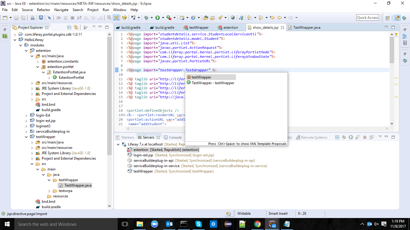 我在生活中是新手,我创建了一个服务包装器UserLocalServiceWrapper名称测试包装器.Now,我尝试在不同的module.But中使用测试包装器,这给依赖关系issue.And带来了奇怪的事情,我无法看到错误。为了更清晰起见,我附上了屏幕截图。