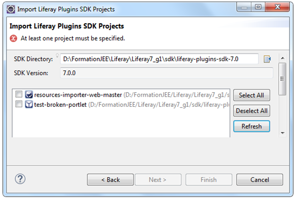 我声明了它与7.0.0+的兼容性,当我从plugins 执行Import-> Liferay项目时,我没有权利放置sdk的路径。默认情况下,它设置为: D:\FormationJEE\Liferay\Liferay7_g1\sdk\liferay-plugins-sdk-7.0.我找不到主题。我做了,但它没有出现。