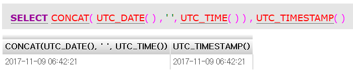 我不相信CONCAT (即使它能工作)。如果实现在午夜之前调用了UTC_DATE(),在午夜之后调用了UTC_TIME(),怎么办?噢,组合起来的绳子已经断了一整天了!