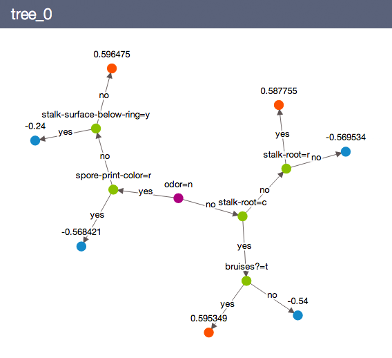 最后一点:不要被树布局上的表面差异所欺骗,这些差异只反映各自可视化包的设计选择;您绘制的回归树(诚然,它看起来并不像一棵树)在结构上类似于从文档中提取的分类--简单地设想一棵自顶向下的树,在顶部是您的odor节点,然后是绿色节点并终止到您的蓝色和橙色节点(并将"yes/no“替换为”True/False“).