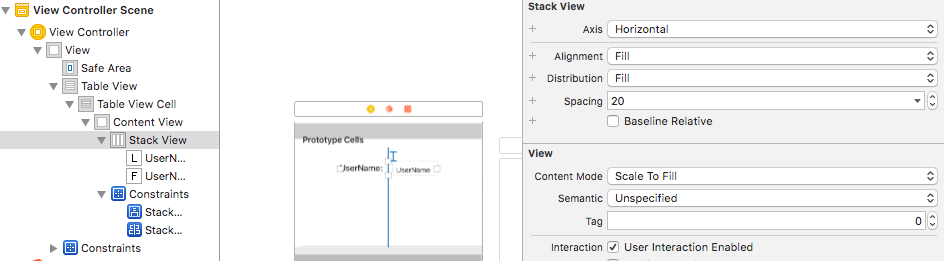 在本例中,我向堆栈视图添加了一个标签和一个文本字段。然后,我将约束添加到堆栈视图中,并将属性检查器中的间距设置为20。