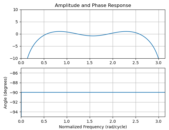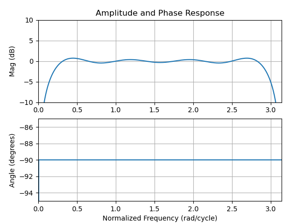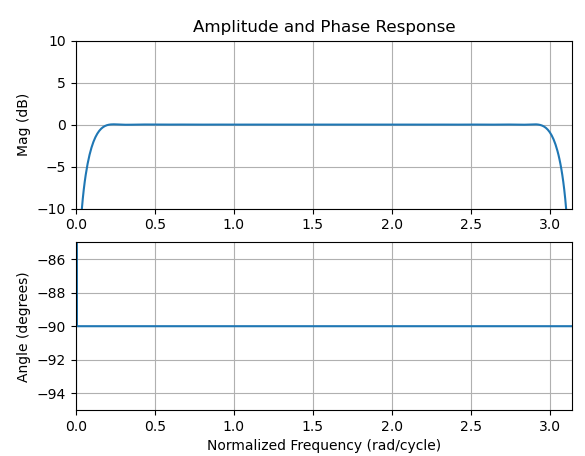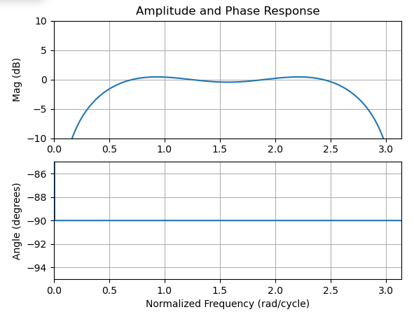 振幅不匹配的原因是由于给定的Hilbert解的频率响应,如下面的图所示,与3个样本的匹配补偿延迟相比,振幅和相位是一致的。在下面的幅值响应中,与图中的幅值差应该与给定频率的幅值完全匹配。