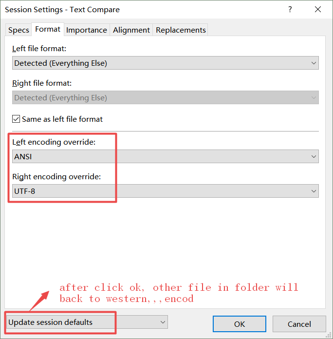 可以以文件格式设置影响所有比较的字符编码覆盖。若要设置编码,请打开Tools \ File Formats。选择与文件匹配的掩码格式。转到转换选项卡。将编码下拉列表从Detect更改为首选编码。