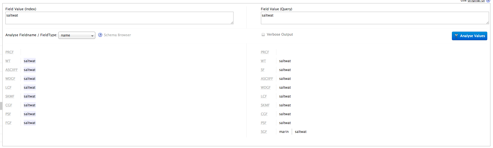 marine现在,当我在管理面板中进行分析并查询saltwat时,就会出现saltwat | marin。这意味着咸水确实在synonyms.txt文件中被树干为synonyms.txt。