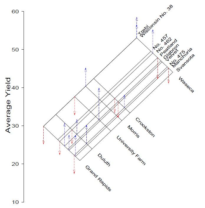 这在R中实现了吗?快速的谷歌搜索什么也找不到。下面是一个例子,用于lattice::barley数据,经过多年的平均处理。箭头显示了相加模型的大残差。