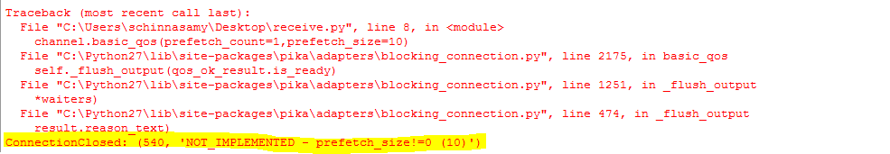 我尝试在Pika rabbitMQ中使用prefetch_size功能。当prefetch_size为零时,我的应用程序正在工作。示例: