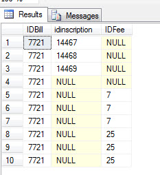 on f.IDfee = i.Idfee当我有IDfee时,IDinscription是空的,当我有IDinscription时,IDfee也是空的。账单和费用都有相同的IDbill。