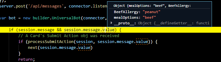 在我对您的自适应卡内容的测试中,实际上,当您的用户单击Action.Submit按钮时,您的机器人可以在session.message.value中获得用户的选择,并且可以将您想要的内容存储在变量中。