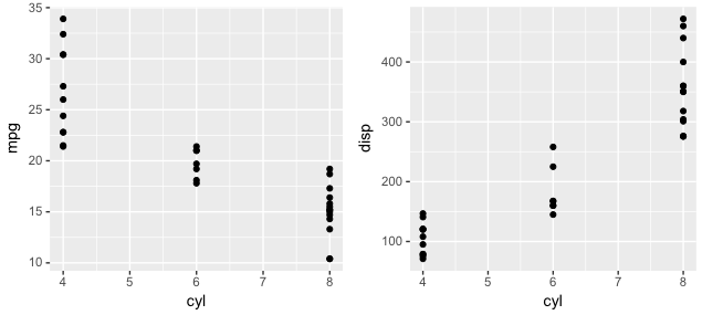 p2 = ggplot(mtcars,aes(y=disp, x=cyl)) + geom_point()