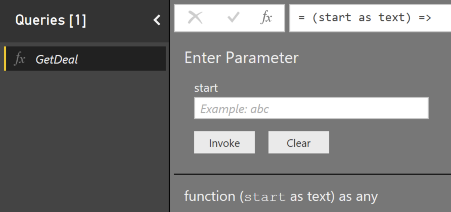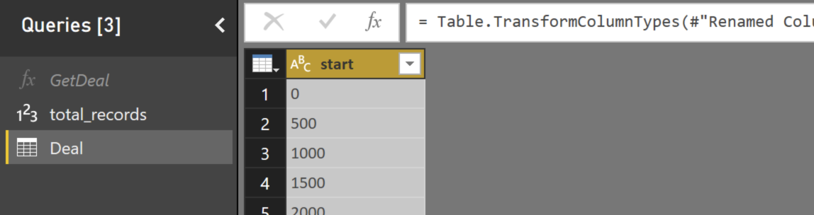 #"Expanded Column1"可以将start参数参数化,并将查询更改为GetDeal函数,如下所示: