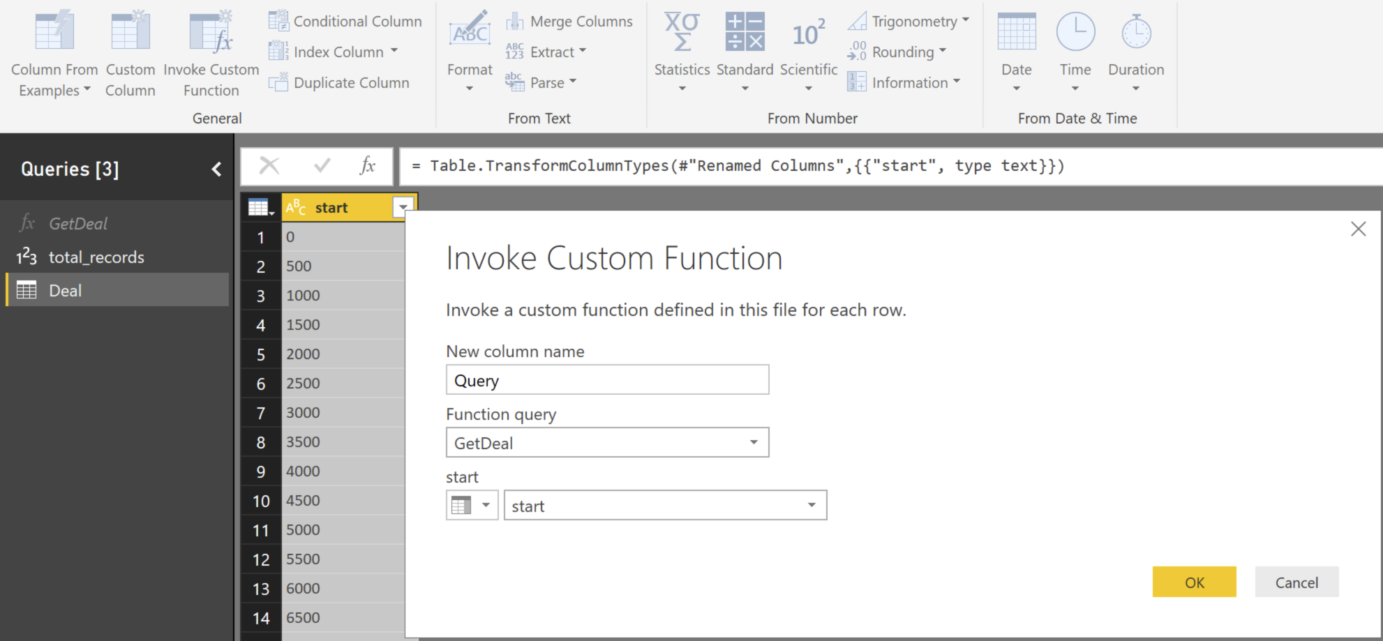 现在我们可以使用列GetDeal调用自定义函数start,如下所示: