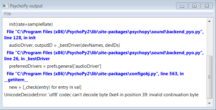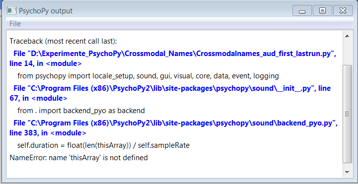 我有以下问题:我在PsychoPy版本1.83.04的计算机上运行了一些实验。由于一些问题,计算机被重新配置,因此PsychPy也更新为1.85.4版本。从那以后,我用声音做的实验不再包括工作。错误消息如下: