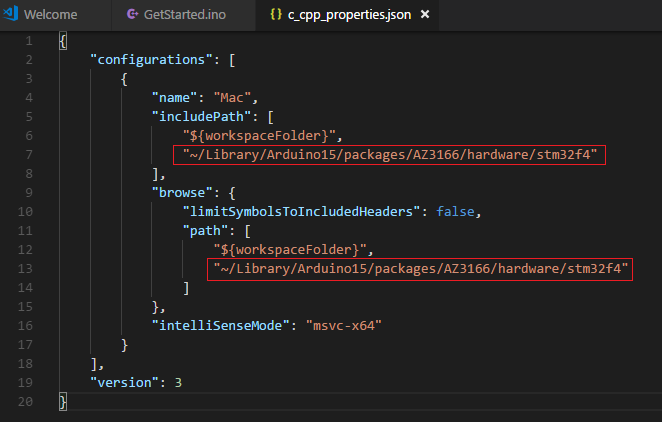 #include "DevKitMQTTClient.h"我所做的是:安装(并运行) Arduino,将Arduino作为/Applications添加到UserSettings.pref中。安装了DevKit,除了这个intellisense/库位置问题之外,几乎所有东西都能工作。